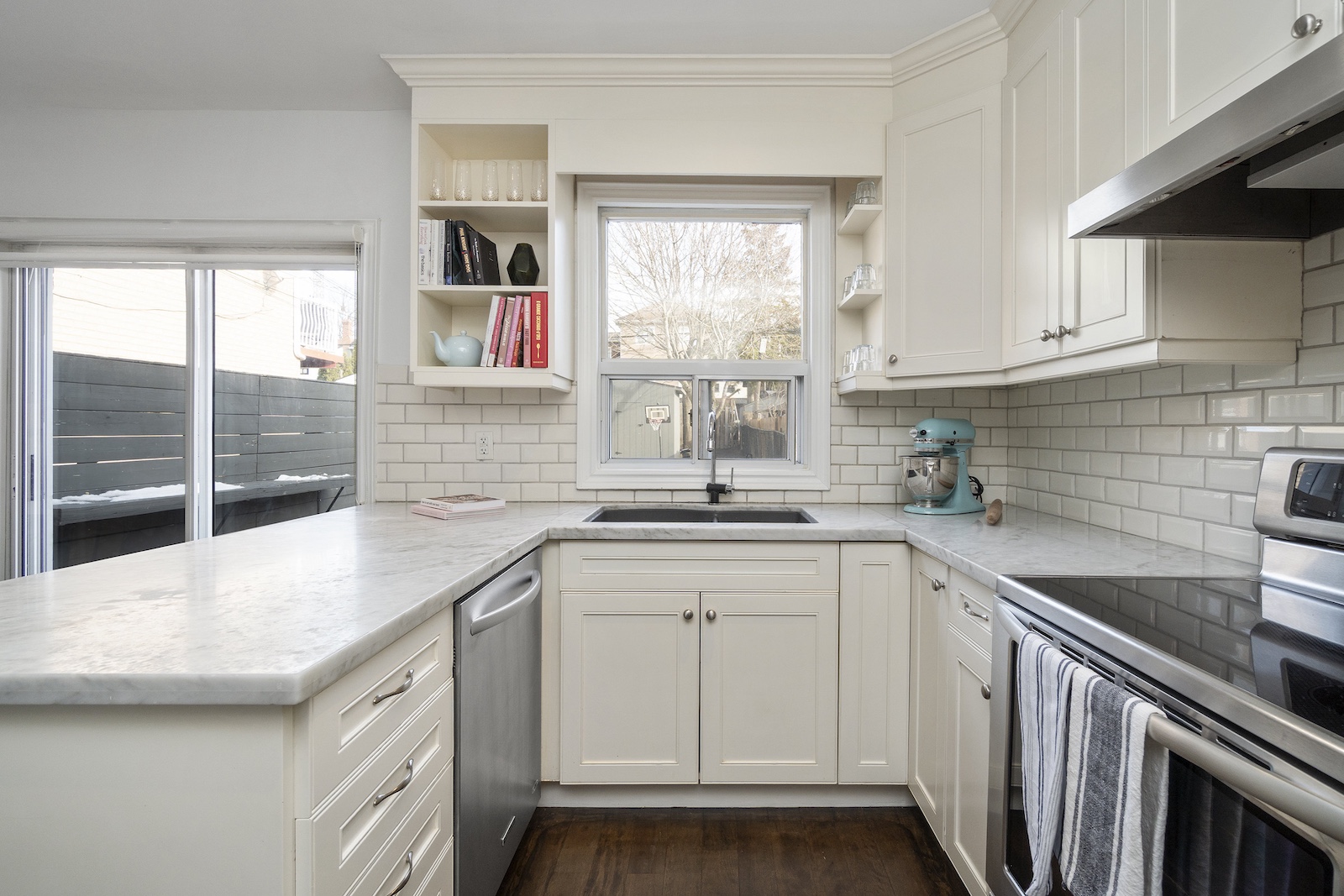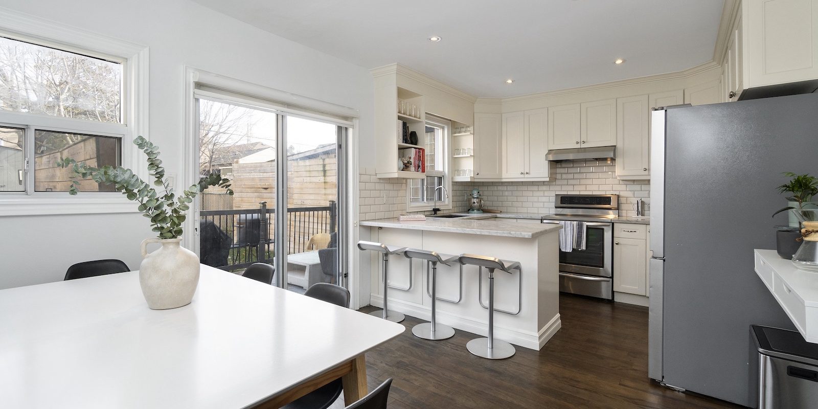 The sun-filled, family-sized kitchen is the heart of the home, thoughtfully renovated with cooking and entertaining in mind. It features Carrera marble countertops, updated appliances, ample prep space & generous storage. It flows effortlessly to the dining area and a private, east-facing backyard complete with a large deck & storage shed – the perfect backdrop for summer gatherings, long dinners & relaxed weekend BBQs.